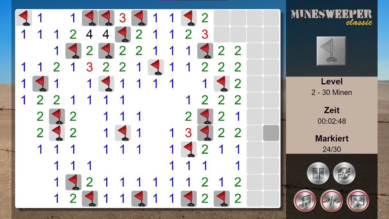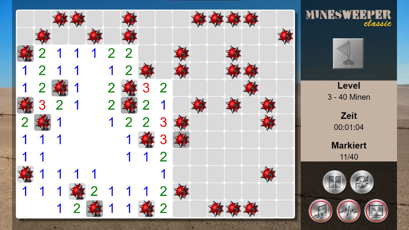 Du stehst auf einem Minenfeld und musst sie finden! Die Minen sind nicht zu erkennen, also musst Du erstmal blindlinks ein paar Felder anklicken und hoffen!
