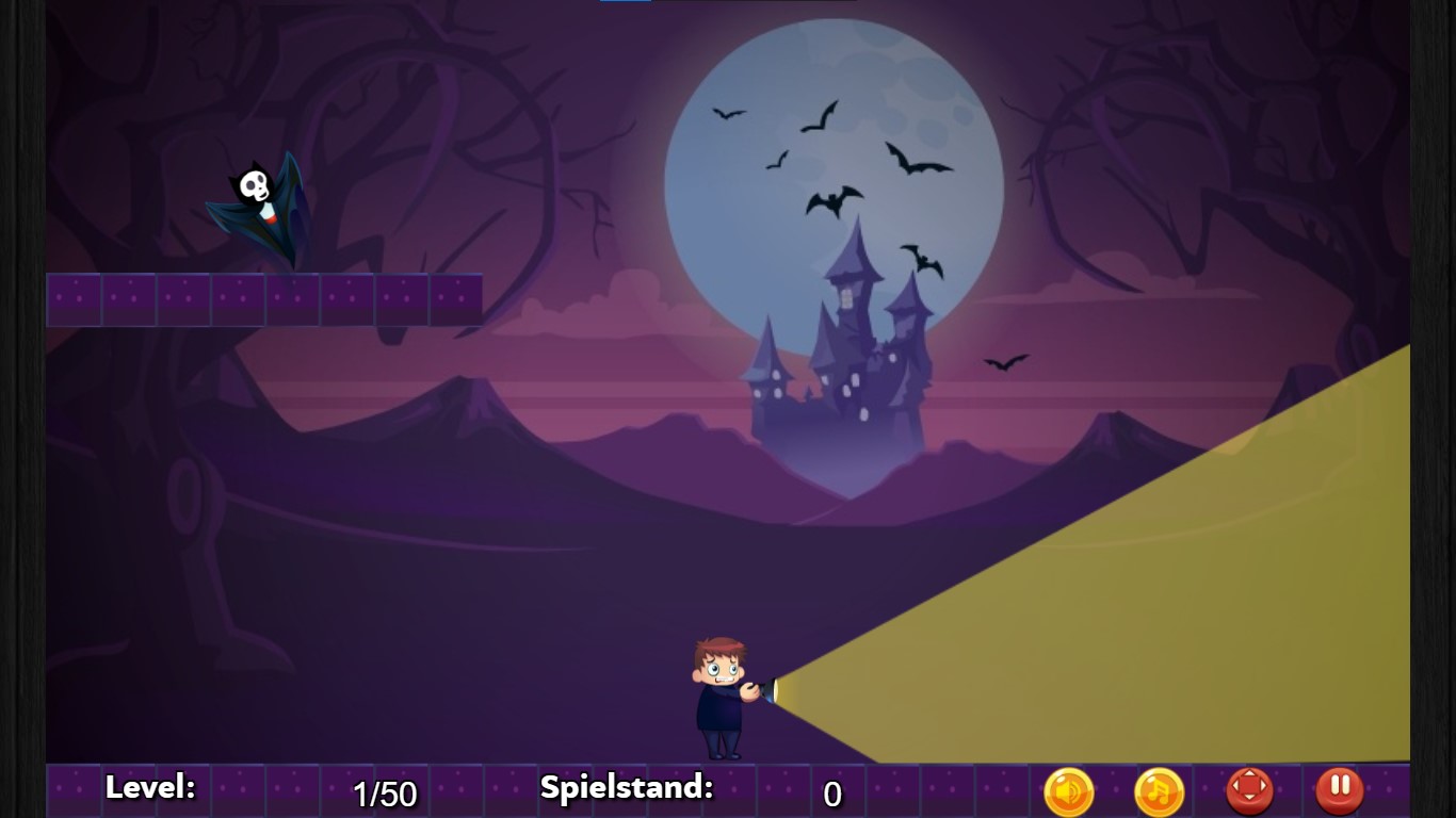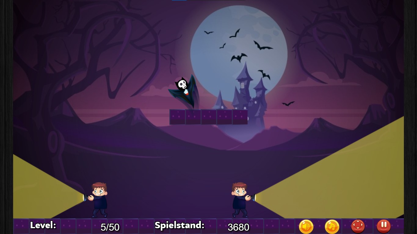 Gegen wen? Gegen dich! Du bist nämlich der Vampir! Weiche dem Scheinwerferkegel aus und versuche, ihn zu überraschen! Mit den Pfeiltasten kannst Du den Vampir an allen Wänden, Mauern und der Decke laufen lassen und hinter ihm abspringen und in den Rücken fallen!